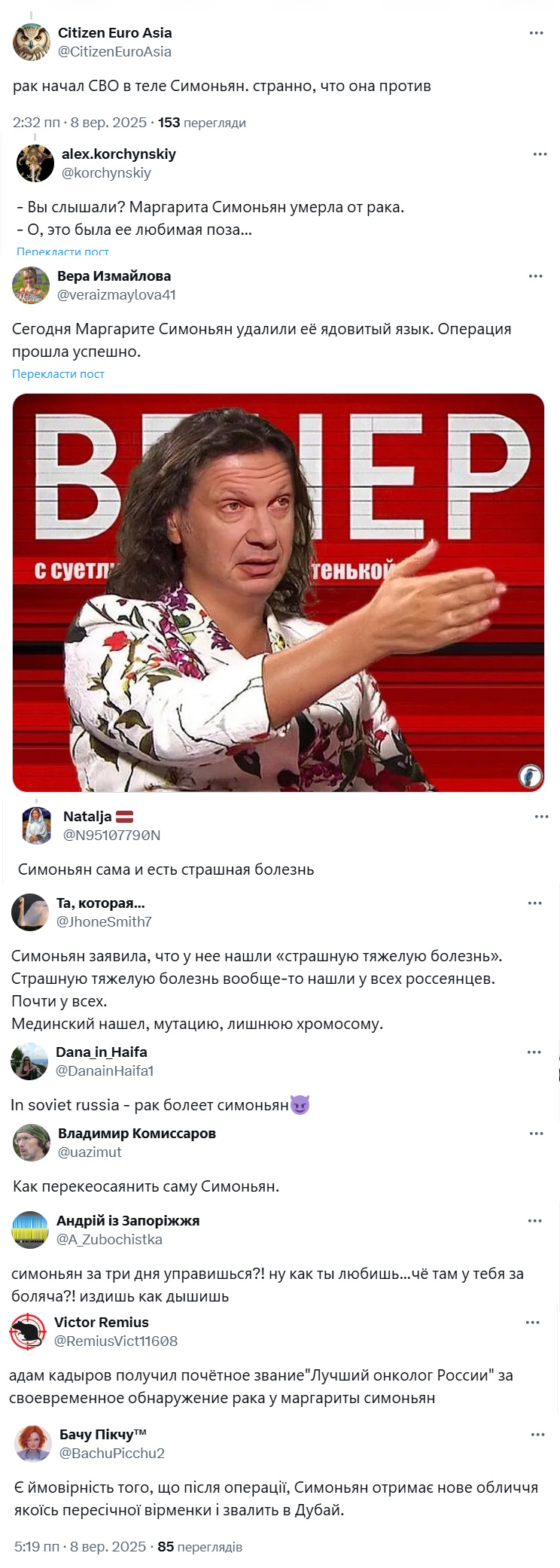 Пользователи сети X тоже не стали оставаться в стороне и выдали целую порцию самых лучших пожеланий Симоньян. А некоторые были убеждены, что Адам Кадыров неизбежно получит медальку "За обнаружение рака".