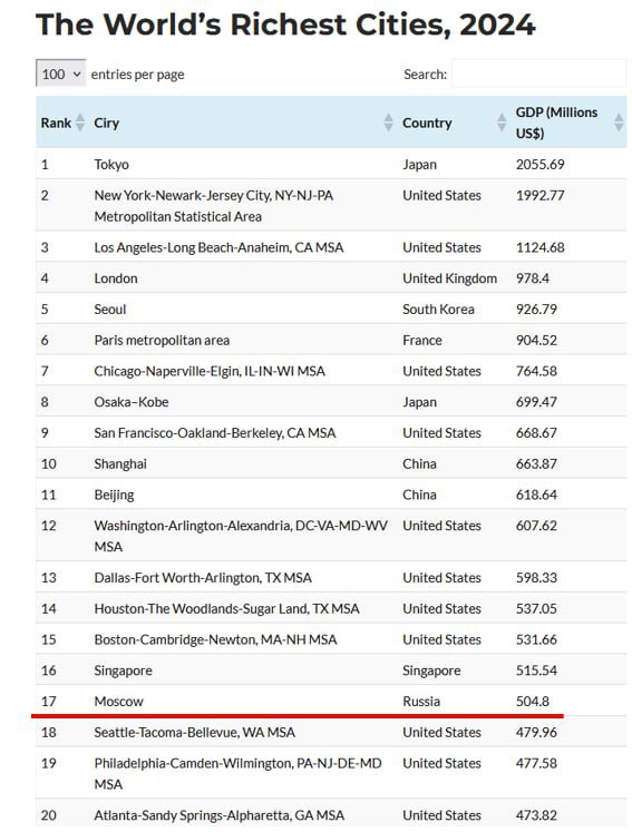 Согласно международным рейтингам "Самые богатые города мира-2024", Москва находится лишь на 17-м месте. Впереди оказались как мегаполисы, так и азиатские центры. Рейтинг возглавляет Токио, десятилетиями считающийся лидером мировой экономики. Далее следуют Нью-Йорк и Лос-Анджелес. Лондон и Сеул замыкают пятерку самых богатых городов. На этом фоне Москва выглядит довольно скромно, несмотря на все попытки Кремля создать картинку "глобальной суперэкономики".