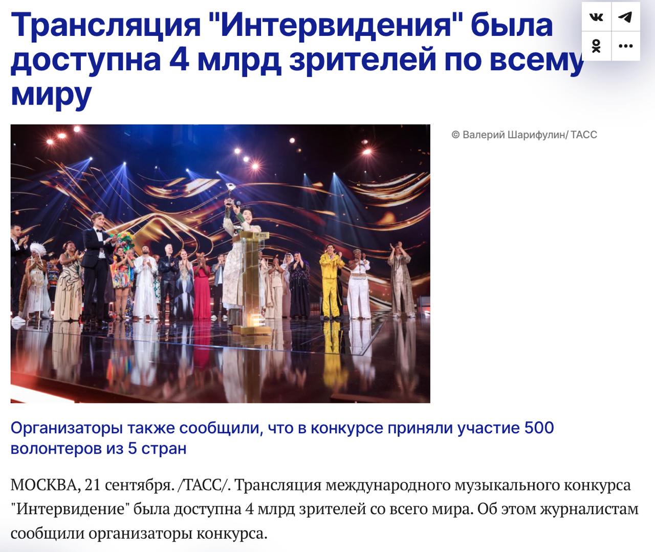 Еще один ляп российской пропаганды — это информация о том, что "Интервидение" посмотрели 4 миллиарда зрителей — то есть каждый второй житель планеты. Однако эту чушь в заголовках российских СМИ быстро отредактировали, заявив, что трансляция была доступна в целом жителям стран в 4 млрд населения суммарно.