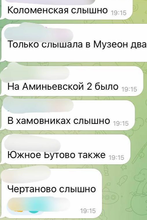 Жители пишут о серии громких хлопков в центре, на юге и юго-западе города. Речь идет о районах: Хамовники, Павелецкая, Солнцево, Царицыно, Очаково, Южное Бутово, Чертаново, Кунцево, Новые Черёмушки, Хорошёвская, Южное Бутово.
