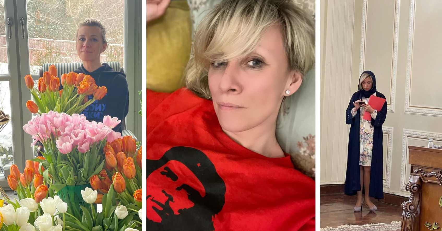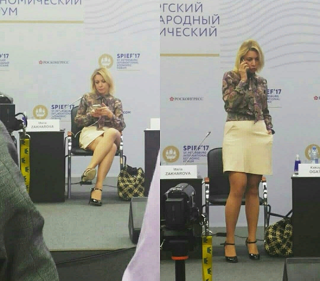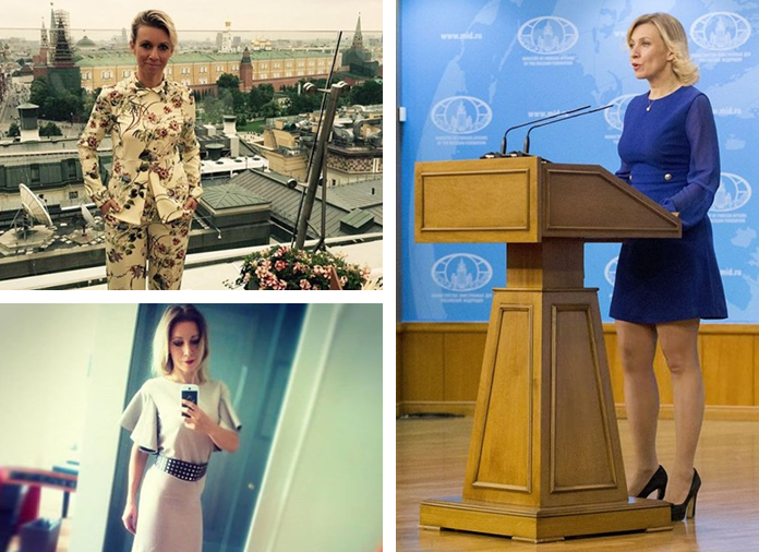 Представительница МИД часто появлялась перед камерами или на официальных мероприятиях в неподходящих для этого образах. Как пишут российские СМИ, Захарова — любительница высоких шпилек, неприлично коротких юбок, пестрых цветастых блузок и броского макияжа, который так и не научилась аккуратно наносить.
