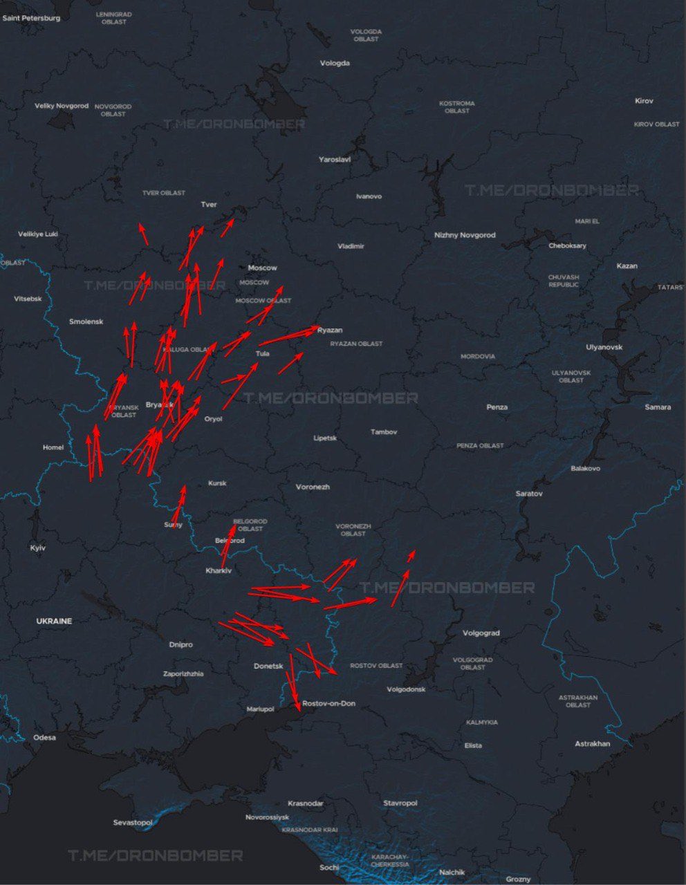 Украинский осинт-ресурс DroneBomber наглядно показал приблизительные маршруты наших БПЛА, заметив, что вся информация взято из российских источников.