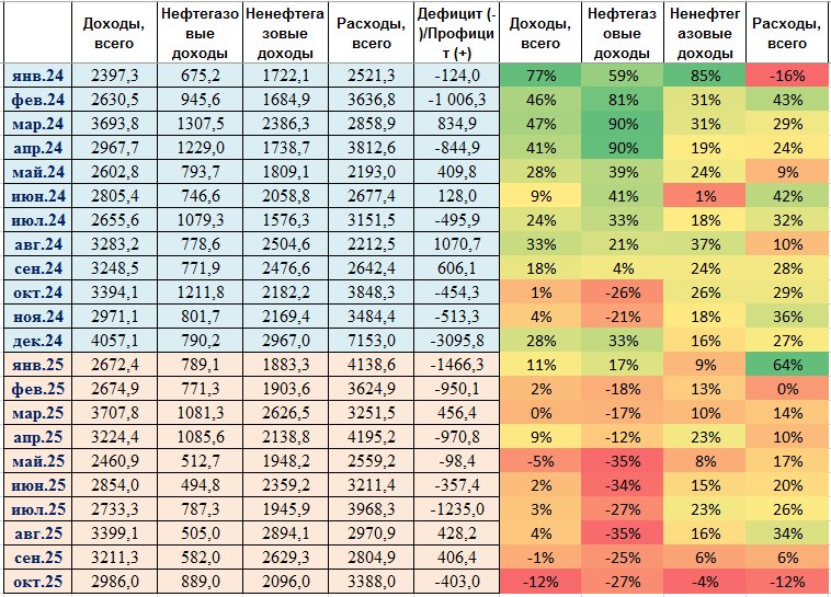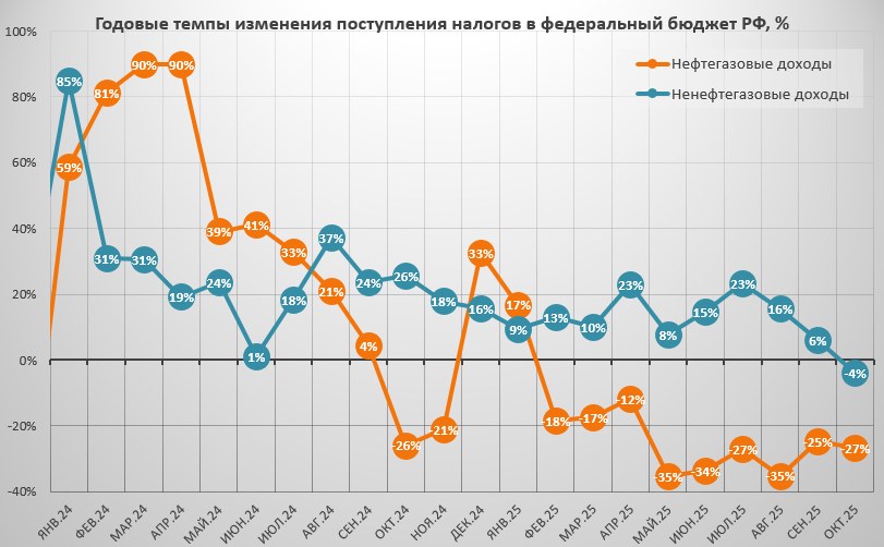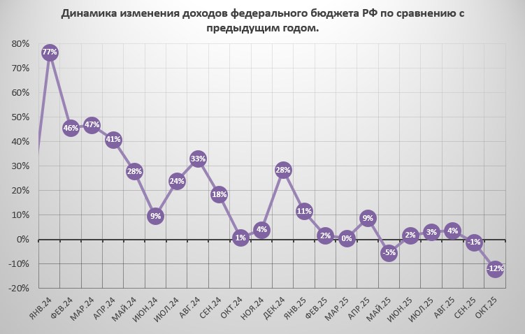 В октябре 2025 года доходы федерального бюджета Российской Федерации рухнули на 12% по сравнению с тем же периодом 2024 года. Правительству пришлось урезать расходы. В целом ситуация напоминает СССР перед его распадом.