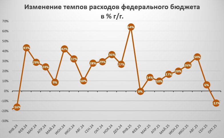 По сути, бюджетный импульс исчерпан: он больше не поддерживает экономический рост, а налоговые поступления обрушились. В таких условиях возвращение к прежним темпам увеличения расходов (около +15% год к году) приведет лишь к лавинообразному росту дефицита.
