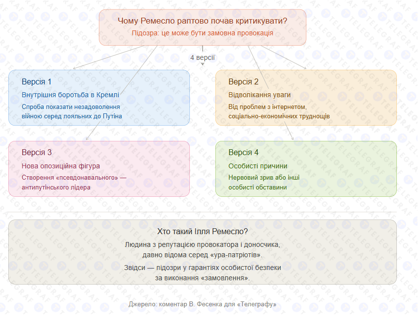 Политолог Владимир Фесенко в комментарии "Телеграфу" сказал, что если бы подобную критику выразил обычный оппозиционер, это было бы одной ситуацией. Но Илья Ремесло — человек с репутацией провокатора и доносчика, долгое время известный среди "ура-патриотов". Именно поэтому резкая смена позиции и громкая критика вызывают подозрения о том, что это может быть заказной провокацией с гарантиями личной безопасности.