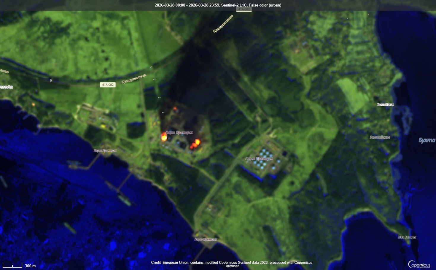 В то же время, по данным спутниковых снимков, после повторного поражения Приморского порта зафиксирован масштабный пожар. Несмотря на низкое качество изображения, видно значительное возгорание, что может свидетельствовать о выгорании части резервуарного парка.