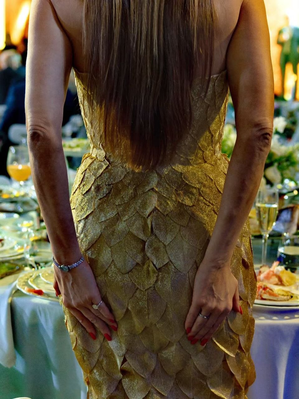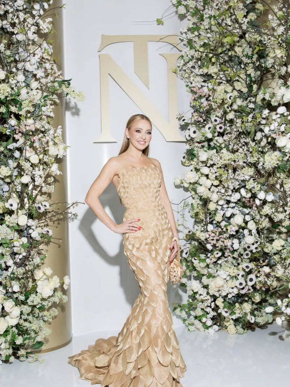 Для празднования Навка выбрала обжатое платье с блестящим эффектом, похожее на "наряд русалки". Образ должен был подчеркнуть фигуру и создать максимально эффектный вид и, судя по фото, был тщательно продуман.