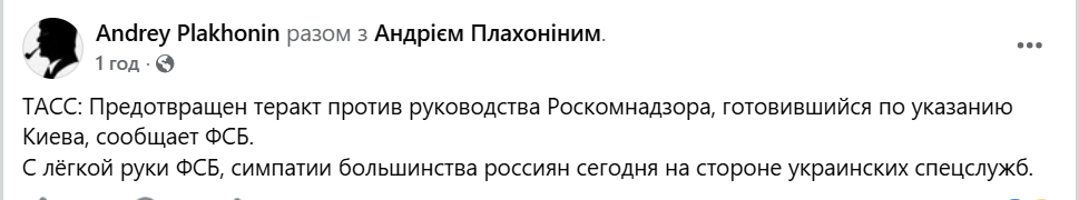 "ТАСС: Предотвращен теракт против руководства Роскомнадзора, который готовился по указанию Киева, сообщает ФСБ. С легкой руки ФСБ симпатии большинства россиян сегодня на стороне украинских спецслужб", — пишет он