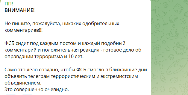 - Не пишите, пожалуйста, никаких одобрительных комментариев. ФСБ сидит под каждым постом и каждый подобный комментарий и положительная реакция – готовое дело об оправдании терроризма и 10 лет. Именно это дело создано, чтобы ФСБ смогло в ближайшие дни объявить телеграмм террористическим и экстремистским объединениям