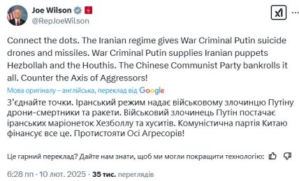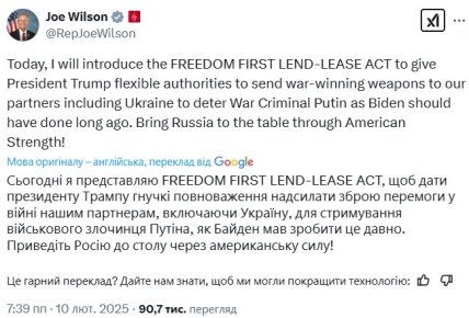 "Сегодня я представлю Закон по ленд-лизу "Свобода прежде всего", который предоставит президенту Трампу гибкие полномочия по отправке победоносного оружия нашим партнерам, включая Украину, для сдерживания военного преступника Путина, как это давно должен был сделать Байден", — написал он.
