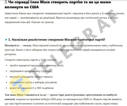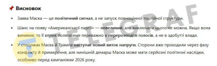Даже если Маск и решится на это, проект будет долгосрочным, ориентированным на промежуточные выборы 2026 или президентские 2028-го. Никаких оснований полагать, что такая партия возникнет и повлияет на политический ландшафт уже в ближайшее время, ИИ не видит.