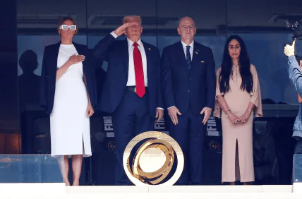 Дональд Трамп снова привлек внимание своим фирменным длинным красным галстуком на финале Клубного чемпионата мира. Мелания дополнила президентский образ стильными очками, ставшими главной деталью ее лука.