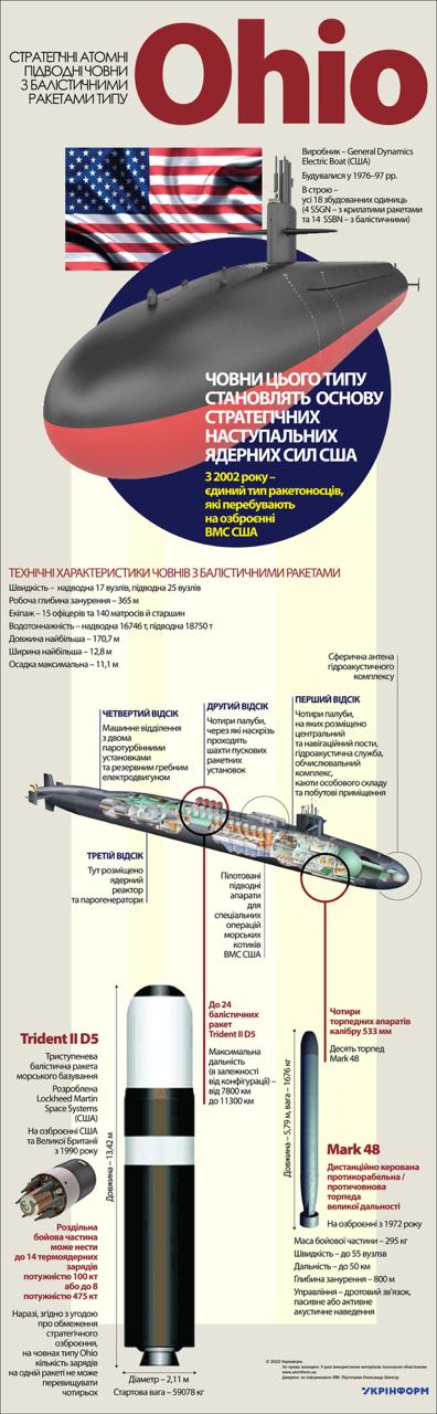 Всего у США 14 атомных подлодок класса "Огайо", каждая из которых способна нести до 24 баллистических ракет Trident II D5, способных доставлять несколько термоядерных боеголовок на расстояние до 4600 миль (7400 км). По данным группы по контролю над вооружениями Nuclear Threat Initiative, всегда на вооружении находятся от 8 до 10 подлодок класса "Огайо".