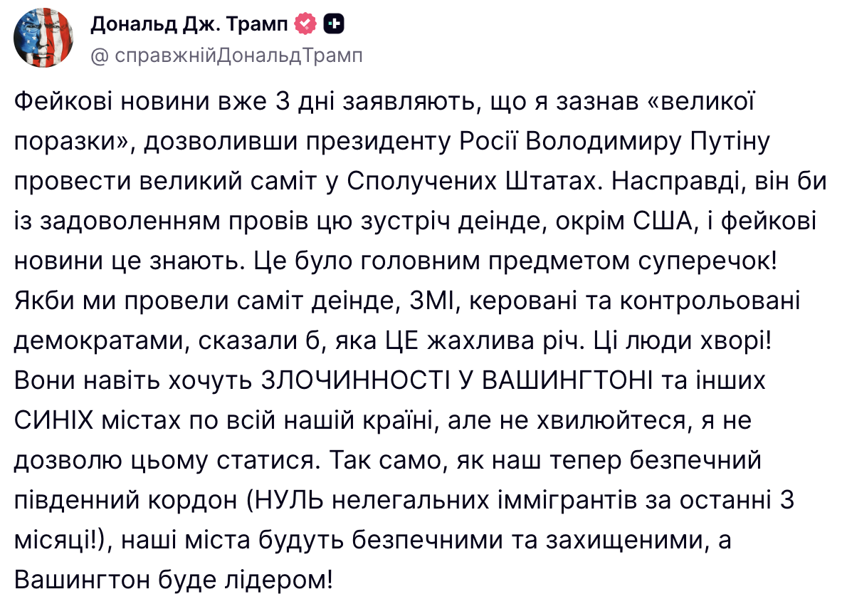Соответствующее сообщение Трамп опубликовал в сети Truth Social. По его словам, уже на протяжении трех дней после встречи СМИ только и пишут о переговорах с Путиным, но хороших новостей мало.