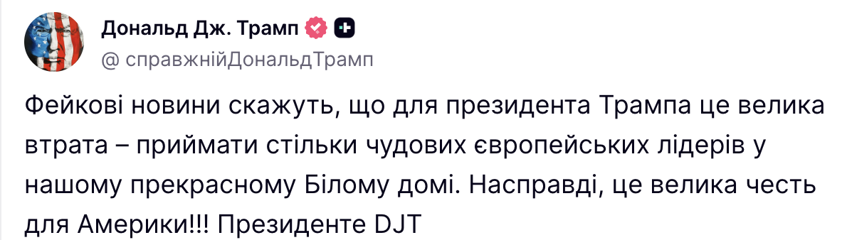 Позже президент США опубликовал еще одно сообщение о "фейковых новостях". Оно касалось визита Зеленского и европейских лидеров в Белый дом.