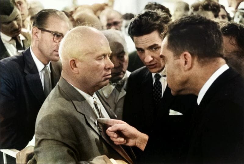 На фото, сделанном 24 июля 1959 во время так называемых "Кухонных дебатов" в Москве, Никсон энергично указывает пальцем на Хрущева, демонстрируя решительность и уверенность в своей позиции. Хрущев, напротив, выглядит более сдержанно и настороженно, что ярко иллюстрирует острое противостояние между двумя сверхдержавами того времени.
