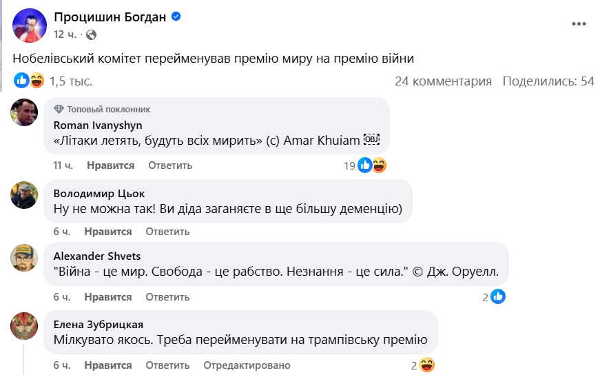 Известный блогер Богдан Процишин отметил, что война ранее не входила в планы Трампа, который хотел запомниться как "великий миротворец". Поэтому он предположил, что Нобелевский комитет теперь тоже сменит название для своей "премии мира".