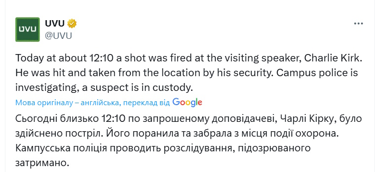 В штате Юта, США, неизвестный выстрелил в правого политического активиста, соратника президента Дональда Трампа, писателя Чарли Кирка. Нападение было совершено во время его выступления перед студентами во дворе Университета долины Юты в городе Орем.