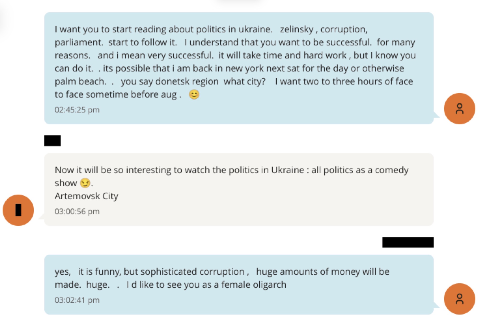 Позже того же месяца, вероятно, Эпштейн дает неизвестной женщине указание "читать о политике в Украине". Когда он уточняет, откуда она родом, собеседница отвечает: из города Артемовск (ныне Бахмут) Донецкой области.