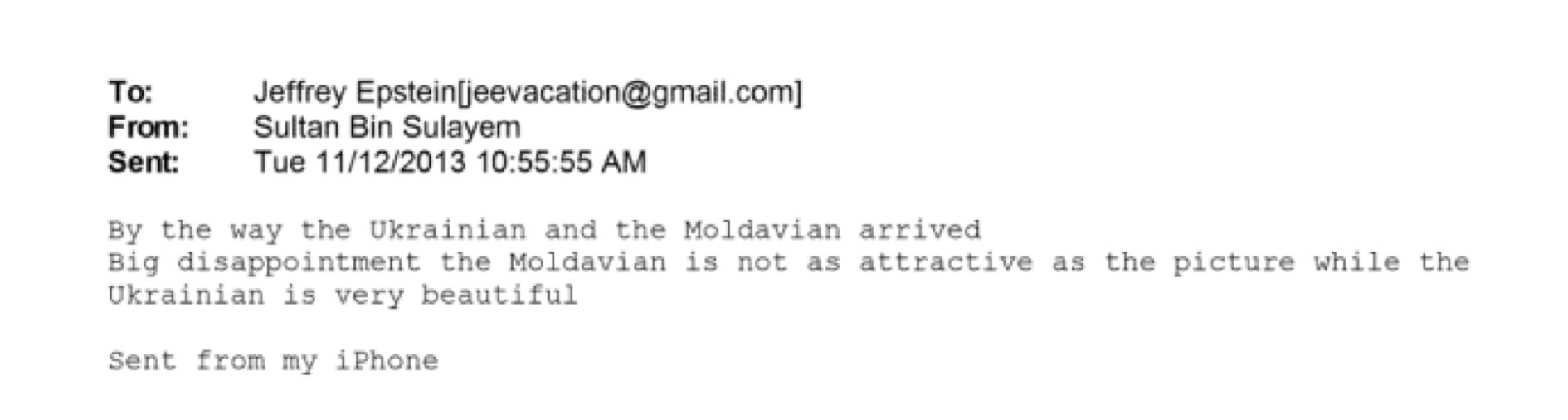 "Кстати, приехали украинка и молдаванка. Большое разочарование: молдаванка не так привлекательна, как на фото, а украинка очень красивая", — писал Эпштейну, вероятно, генеральный директор дубайской логистической группы DP World Султан Ахмед бин Сулейем.