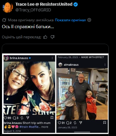 Пользователи платформы X также ранее указали на фотографии Брины Кнаусс с ее предполагаемыми биологическими родителями, включая снимки с матерью (2014 год) и более поздние изображения отца.