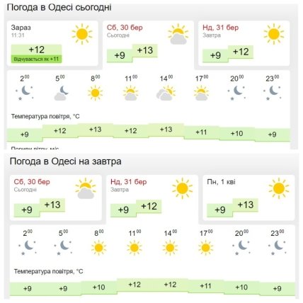 В воскресенье, 31 марта, в Одессе погода будет солнечной, а термометры покажут от +9 до +12 градусов. Порывы ветра ожидаются до 9 м/с.