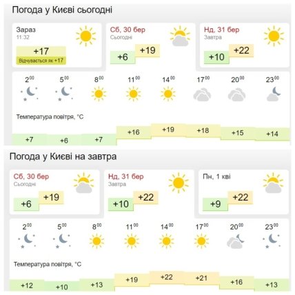 В Киеве в субботу, 30 марта, ожидается теплая и солнечная погода, но с переменной облачность. Температура воздуха будет колебаться от +7 до +19 градусов. Порывы ветра 3-9 м/с.