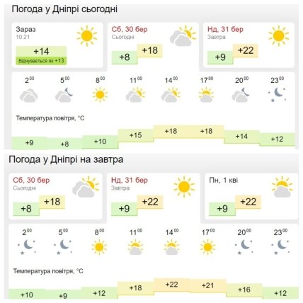 В Днепре 30 марта будет солнечно, однако небо может затянуть облаками. Температура воздуха ожидается от +8 до +18 градусов. Порывы ветра 4-7 м/с.