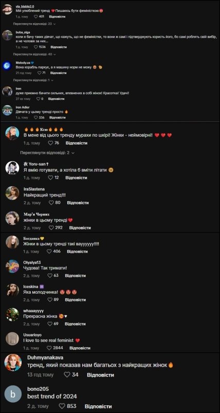 Среди прочего, тренд этот оценили и в Украине. "Мой любимый тренд. Горжусь быть феминисткой", "Девушки в этом тренде просто огонь", "Очень приятно видеть сильных, уверенных в себе женщин", "У меня от этого тренда мурашки по коже. Женщины — невероятны", "Тренд, который показал нам многих лучших женщин", — пишуть украинки в комментариях.