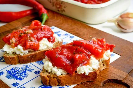 Речь идет о закуске из запеченного перца и хлеба. А рецептом с нами поделились на Instagram-странице "nata.cooking".