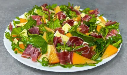 6.На тарелку выложить рукколу, сверху кусочки сыра, хурмы и хамона. Полить салат соусом.