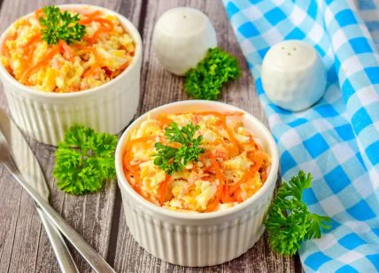 4. Сюда добавить морковь по-корейски, заправить майонезом, перемешать и можно есть.