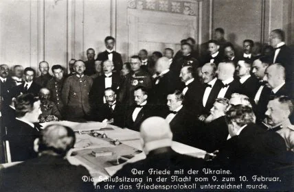Поздним вечером 9 февраля 1918 года в Брест-Литовском, где находилась штаб-квартира немецкого командования Восточного фронта, состоялось подписание сепаратного мирного договора между странами Четверного союза (Германией, Австро-Венгрией, Турцией, Болгарией) и Украинской Народной Республикой. Это был первый мирный договор в рамках Первой мировой войны (1914—1918).