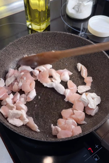 6.Для начинки обжарить до готовности куриное филе, специи добавить по вкусу и отварить до полуготовности брокколи 2-3 минуты, не более, после сразу переложить его в холодную воду, это поможет сохранить яркий цвет.