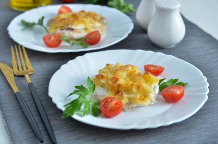 8.Сверху смазать майонезом (можно заменить сметаной+соевым), выложить консервированные ананасы, засыпать твердым тертым сыром и запекать 15-20 минут при температуре 180 градусов.