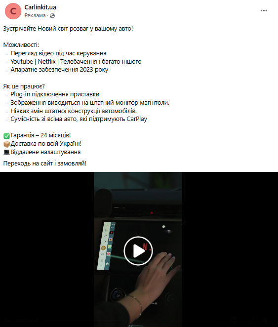 Рекламное объявление одной из украинских компаний о возможности просматривать видео при управлении автомобилем вызвало бурную реакцию пользователей соцсетей. В объявлении среди ключевых возможностей продукта прямо указана функция "просмотр видео во время управления".