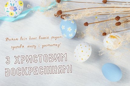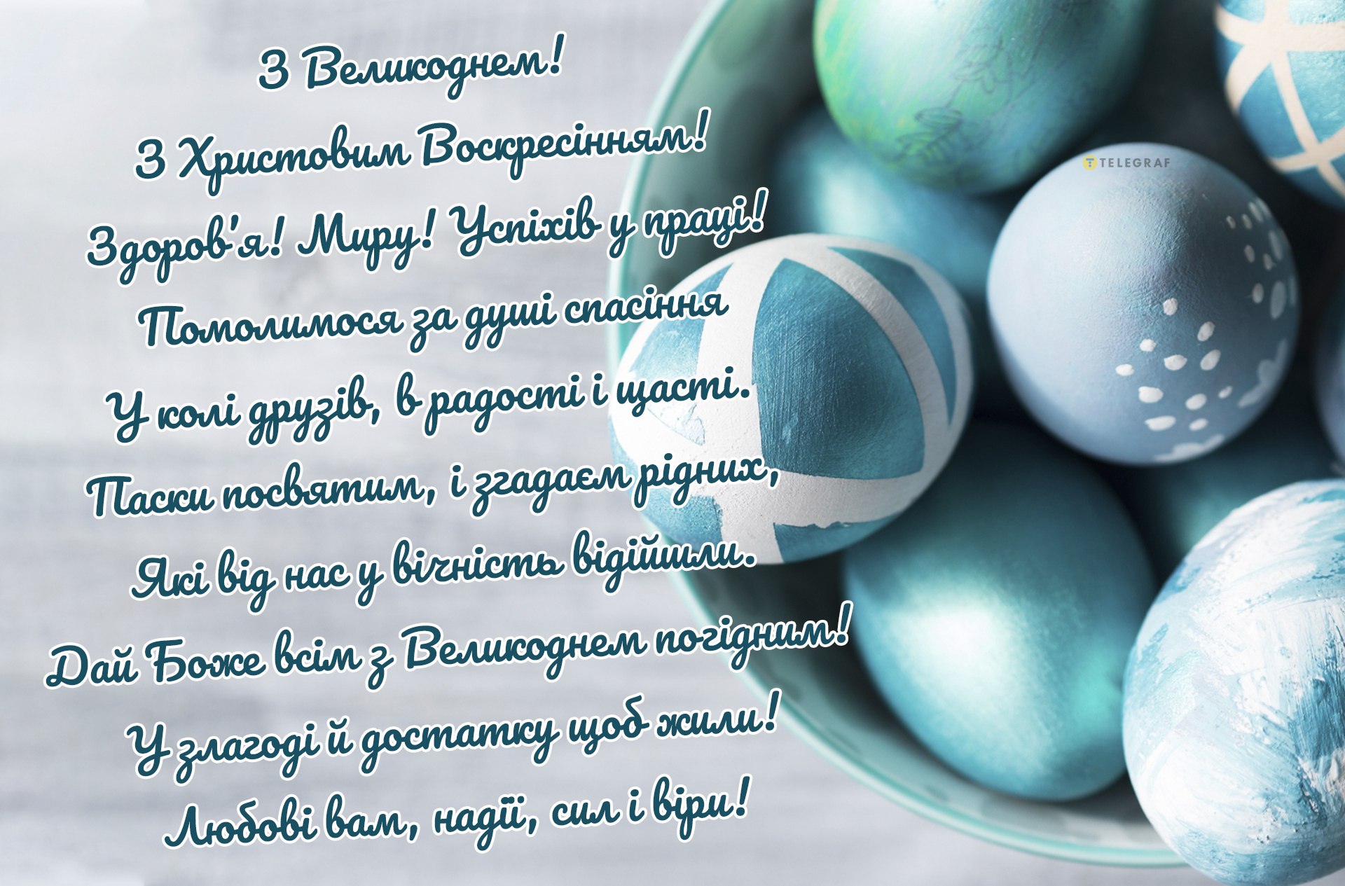 Вітаю з Великоднем. Бажаю щастя та здоров’я, миру та любові, радості та світлої надії, віри та натхнення, гармонії та доброти. Нехай Господь укриває від злиднів, нехай твоє серце дарує турботу та щирі співчуття оточуючим.