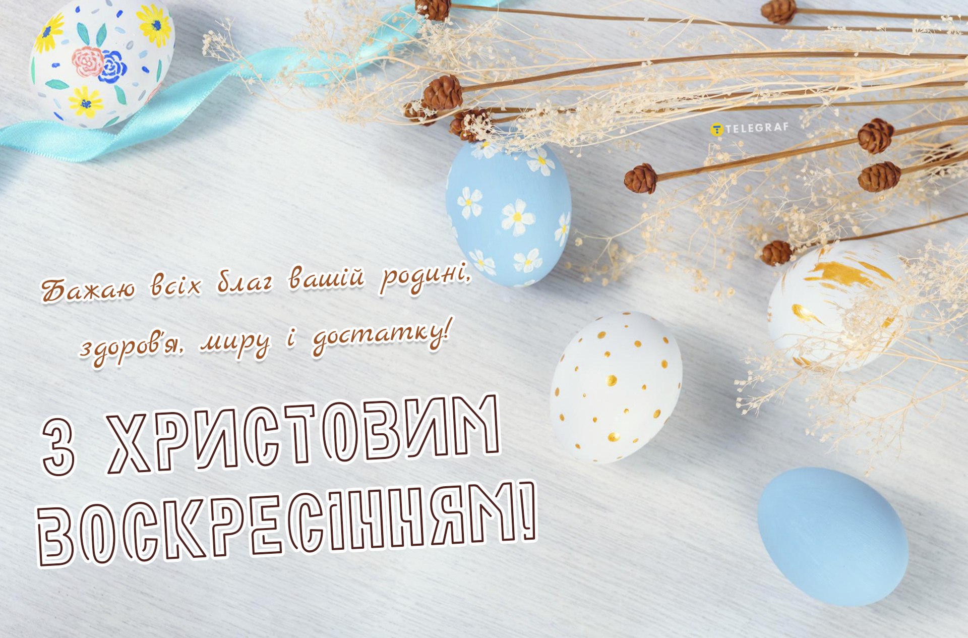 Вітаю з Великоднем та щиро бажаю блакиті у небі, надії в душі, щастя на серці та великої любові у житті. Нехай Господь дарує мир та благодать, нехай з цим святом весна для тебе подарує безмежну радість, домашній затишок та добробут сім’ї.