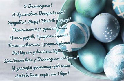 Вітаю з Великоднем та від усього серця бажаю все лихе залишити у минулому та з новими надіями, з доброю совістю, з чистими помислами, з щирими усмішками відкрити нову сторінку у своєму житті. І нехай на цій сторінці панує щастя, кохання та віра. Будьте здорові та живіть у мирі.