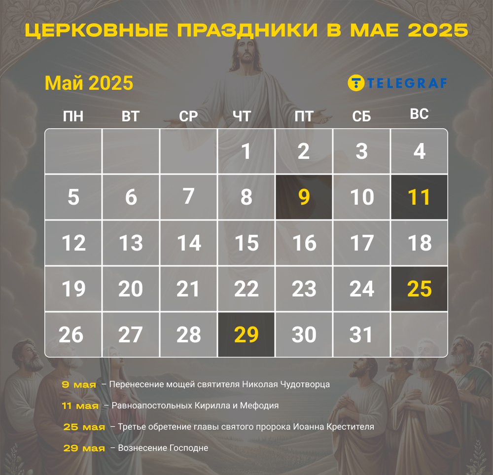 В последнем месяце весны мы будем отмечать один из двенадцати самых больших праздников — Вознесение Господне. Его дата переходная и зависит от даты празднования Пасхи, которая в 2025 году выпала на 20 апреля. "Телеграф" подготовил для вас церковный календарь на май.