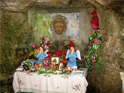 В середине пещеры буквально в стене вытесана чудодейственная икона. Ее заметили еще первые монахи, а впоследствии богомазы разрисовали стену. Некоторые легенды говорят, что краски со скалы постоянно "исчезали" якобы пещера впитывала их в себя.