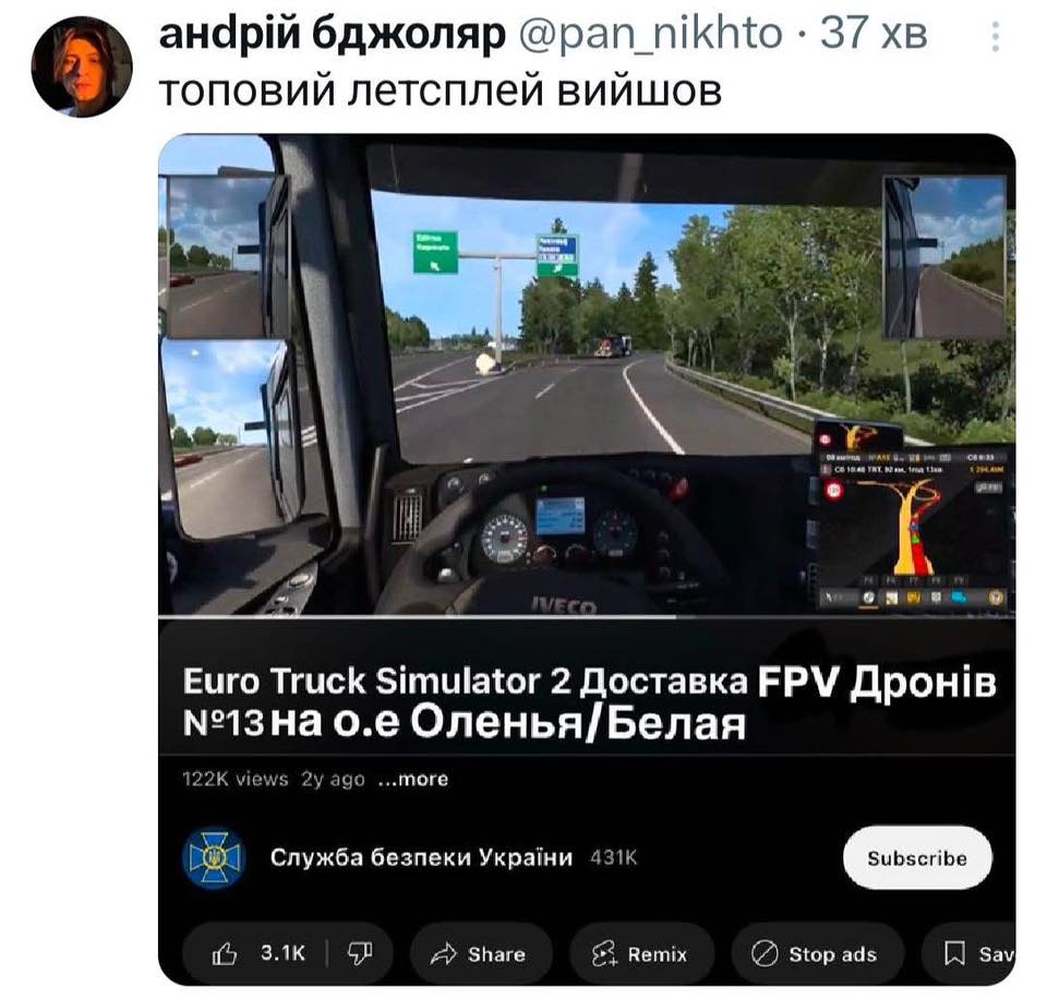 Также украинцы показали в виде водителя автомобиля Алексея Арестовича и Владимира Путина, который, по большому счету и направил дроны на аэродромы, поскольку развязал войну и в итоге спровоцировал проведение украинской спецоперации. Автор мема с Путиным подписал его так: "Йокарний бабай, Владимыч, жми!"