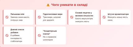 Чтобы удешевить шоколад, производители могут использовать в нем вместо масла какао вредные трансжиры – пальмовое или кокосовое масло. Плитки, в составе которых кроме какао-масла есть растительные жиры, не являются шоколадом в полной мере. Также в составе хорошего шоколада не должно быть консервантов, искусственных ароматизаторов (типа вкус идентичный натуральному), красителей, усилителей запаха и вкуса.