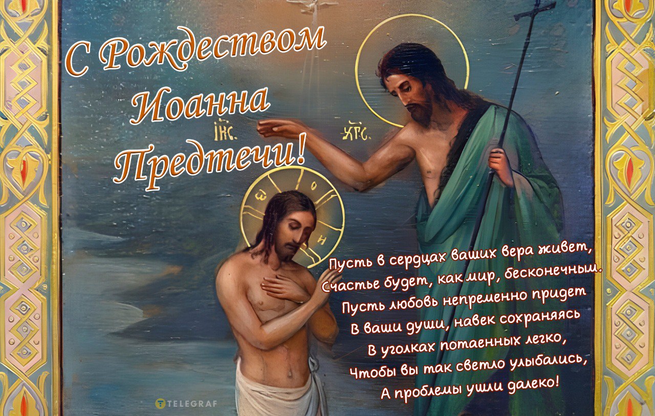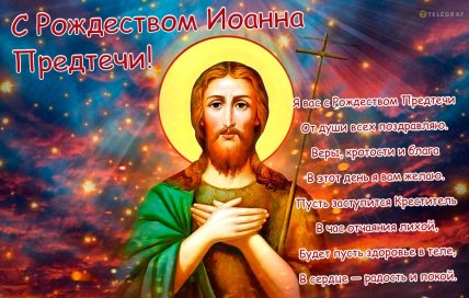 Поздравляю с Рождеством Иоанна Предтечи, пророка и крестителя Господня! Пусть его призыв к покаянию и праведности вдохновляет тебя на чистую и светлую жизнь. Желаю Божьей помощи и душевного тепла!