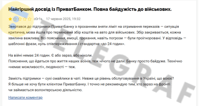 "Банку просто безразлично. Технически "нет возможности", человечности — тоже… Неужели это уровень обслуживания в Украине, которая воюет? Я больше не хочу быть клиентом ПриватБанка. И точно не рекомендую тем, кто сейчас на фронте, или занимается волонтерской деятельностью", — резюмировал клиент.