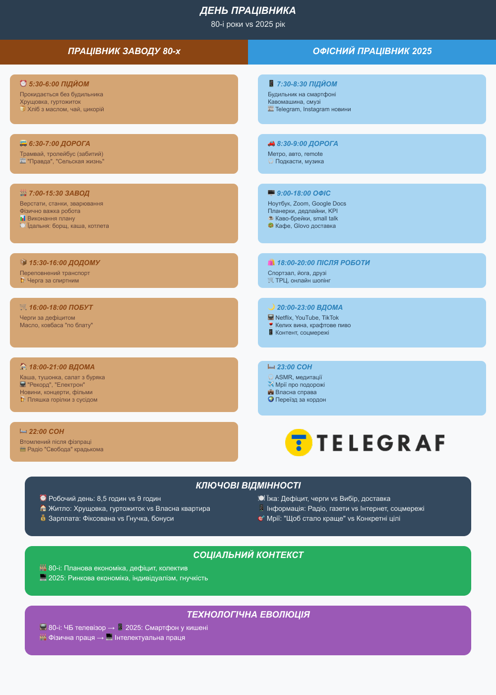 Сравнивая обычный день советского заводского рабочего 80-х годов с современным офисным работником, становится очевидным масштаб технологической революции, кардинально изменившей нашу повседневную жизнь.