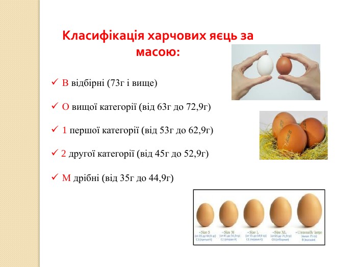 Категорию яиц по размеру: