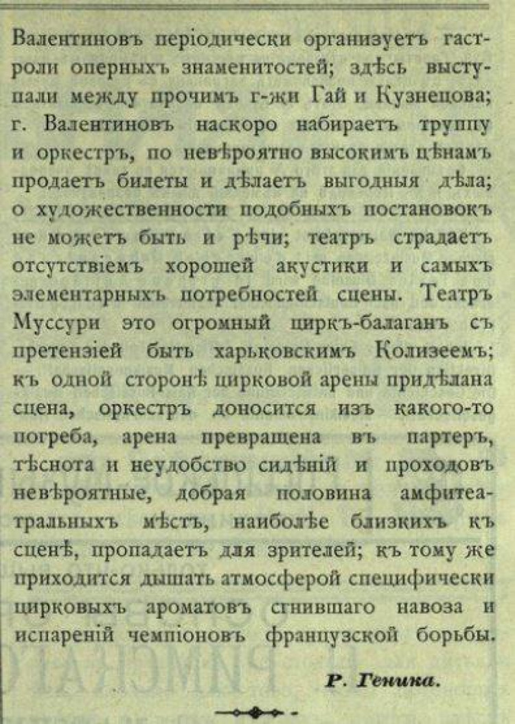 В 1911–1989 годах театр Муссури считался самым большим сооружением Харькова. Однако зрители бойкотировали это место, поскольку считали, что Муссури предал братьев Никитиных, с которыми долго сотрудничал. Также в цирке происходили несчастные случаи: лев загрыз дрессировщицу, а также акробат сорвался с высоты и погиб. К тому же был пожар, унесший жизни участников труппы.