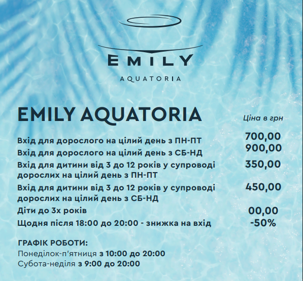 Emily Resort предлагает две зоны с бассейнами. В "Акватории" комфортнее отдыхать с детьми, ведь там есть горки и детская площадка. Стоимость входа для взрослого в эту зону по 700 грн. в будни, 900 грн. в выходные. Для детей 350/450 грн соответственно.
