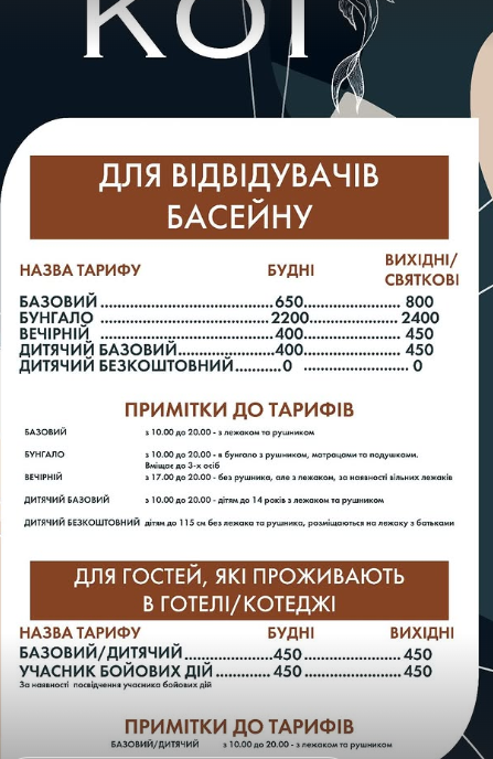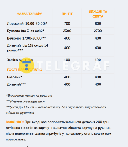 В пятницу, субботу и воскресенье цены растут: зеленая зона – 550 гривен, шезлонг – 700, комфортный вариант – 800. Шезлонг-ракушка для двоих стоит 1400, а бунгало – 2500 гривен. Для детей в эти дни вход составляет 400 гривен.